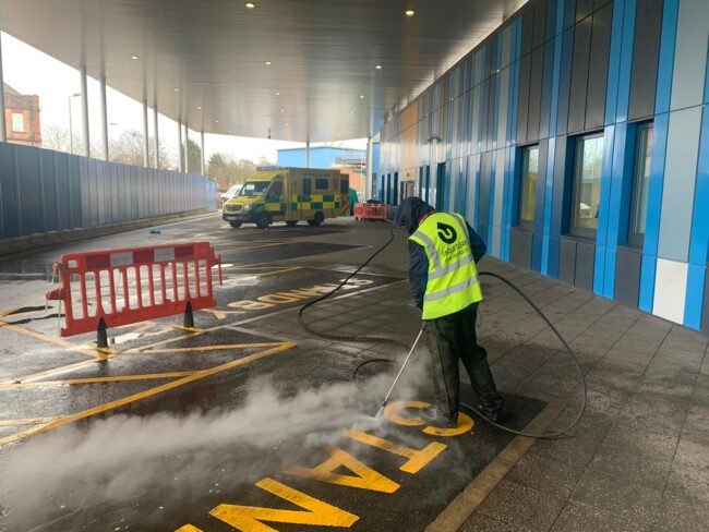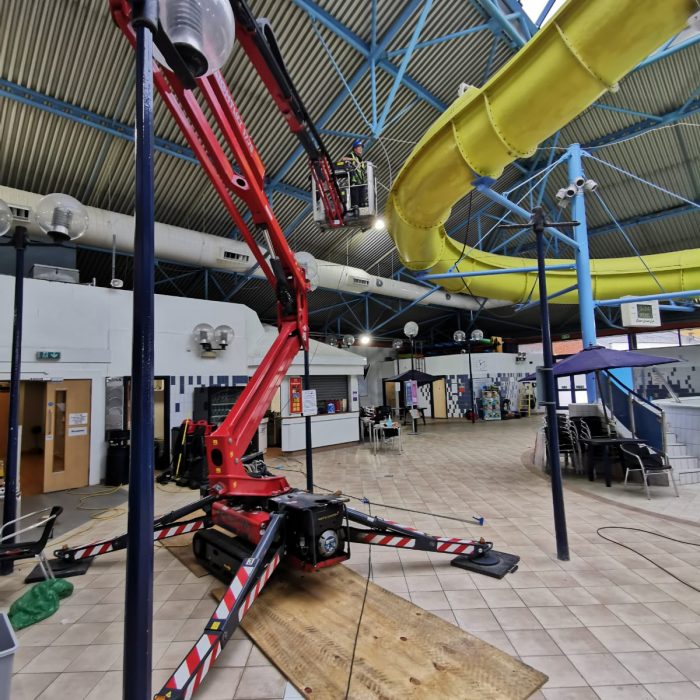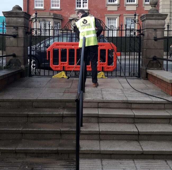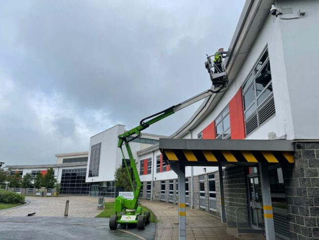 We’ve been working over in Oldham, doing some high-level steelworks cleaning at Newman RC College.